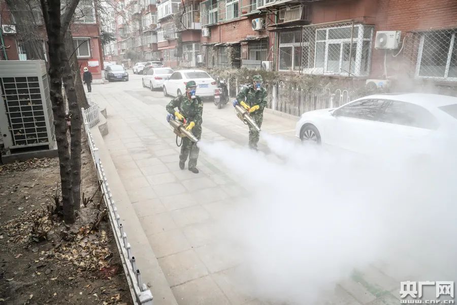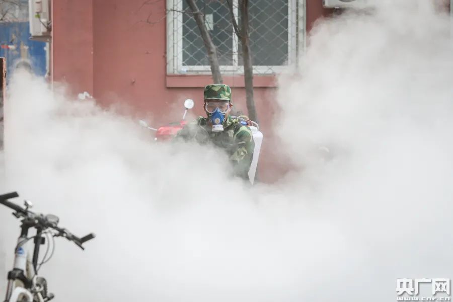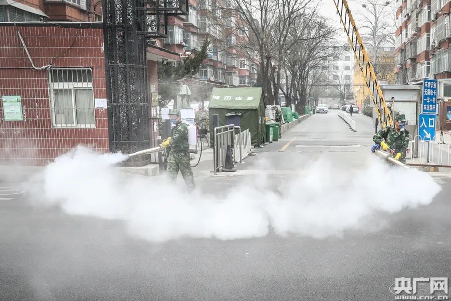 队员正在小区内进行消杀(央广网记者 韩靖 摄)