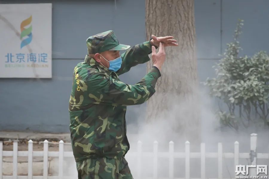 正在北京市海淀区一小区内进行义务消杀防控工作。
