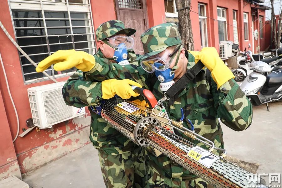 张喜忠(右)正在和队员进行消杀工作(央广网记者 韩靖 摄)