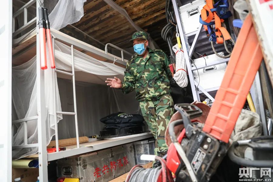 在防汛车内不仅有维修工具,也有床、食品等保障物资(央广网记者 韩靖 摄)