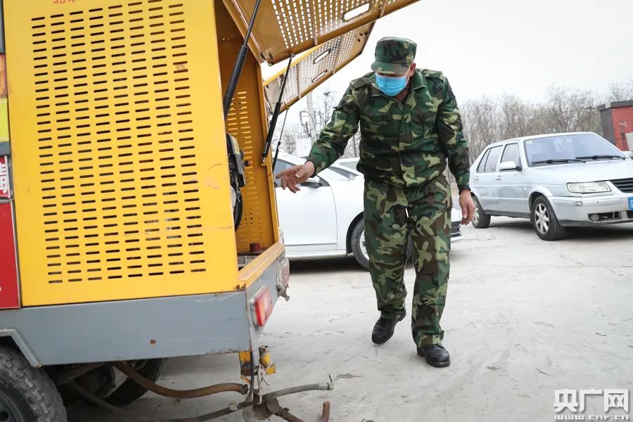 张喜忠向记者介绍之前用的消杀设备(央广网记者 韩靖 摄)