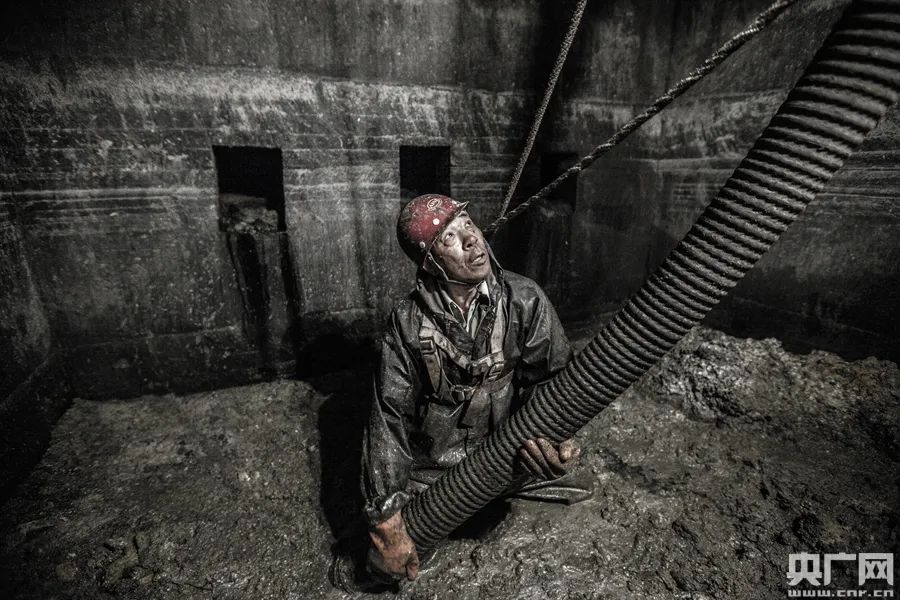 张喜忠在化粪池里进行排污作业【图片摄于2015年4月】(央广网记者 韩靖 摄)