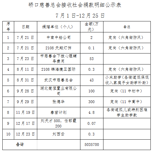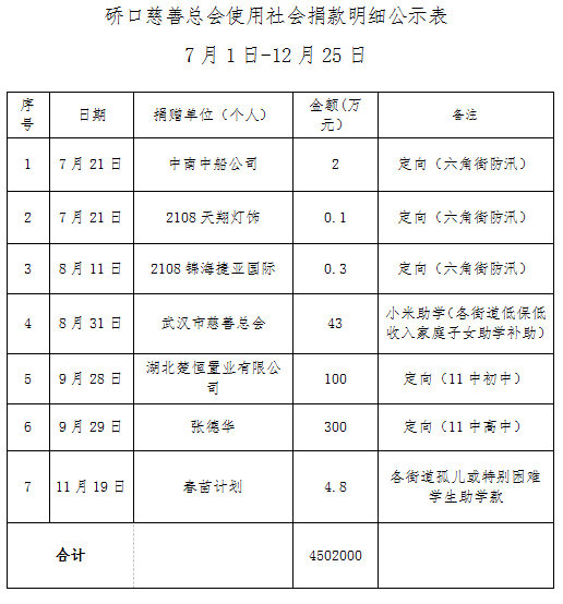 硚口慈善总会负责接受社会各界捐赠,疫情后7月1日-2020年12月31日,硚口慈善总会累计接受捐款12笔,共计7585700元。其中12月24日武汉市慈善总会捐款132万元及12月28日武汉市红十字会社会捐款123万元已公示。现将未及时公示做如下公告(明细附后)。