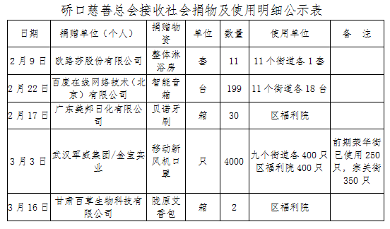 自新型冠状病毒感染的肺炎疫情发生以来,社会各界踊跃捐款捐物, 大力支持硚口区疫情防控工作。1月27日—4月30日,累计接受捐赠物资65笔,其中60笔与疫情相关防控物资已在疫情期间下发同时公示,剩余5笔物资作为后续疫情防控物资现已分发各街道,做如下公示(明细附后)。