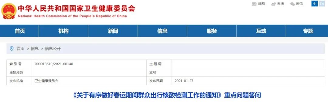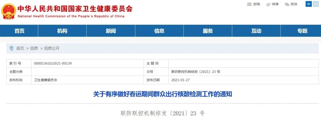 为做好春运期间群众出行核酸检测工作,《通知》自下发之日起开始执行。持新冠病毒核酸检测阴性证明出行从2021年1月28日春运开始后实施,至2021年3月8日春运结束后截止。
