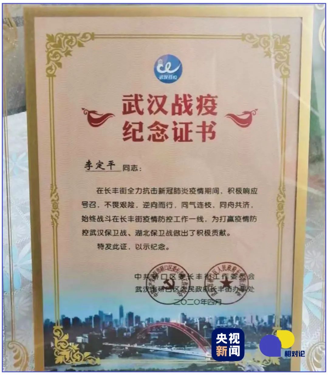 疫情结束后,李定平因为参与一线战疫获得了纪念证书。这张证书现在被儿子李安阳放在了卧室的床头,在他眼中,这是父亲用生命换来的东西。