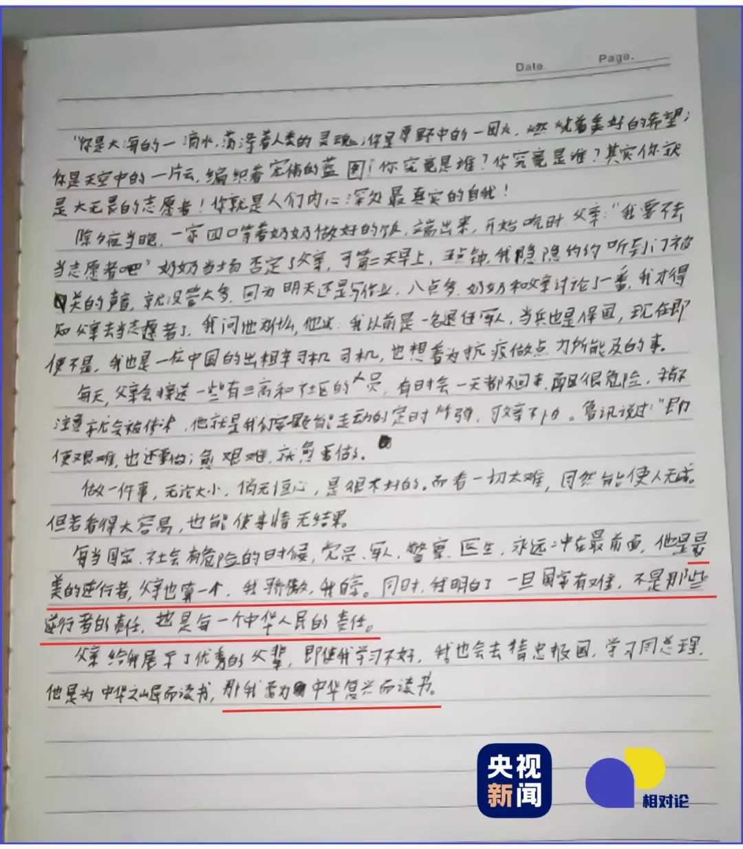 李安阳在一篇作文中写道: 最美的逆行者,父亲也算一个。我骄傲,我自豪。一旦国家有难,不只是那些逆行者的责任,也是每一个中国人的责任。我,要为中华复兴而读书。