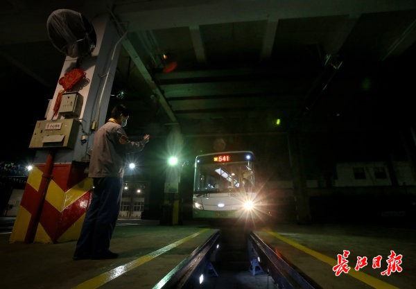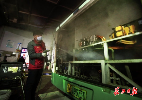 这项工作是从2月15日大年初四开始的。 一辆541路驶入,司机着急地反映:“师傅,刷卡机黑屏了。”老家黄石的机电组长刘合杰马上上前查看,经过检查,发现了故障,立刻接上备用电源线,仅用了5分钟,刷卡机恢复了正常。 “清洗环节一个不能漏!”来自湖南衡阳的技工宋先胜在值班负责人李云峰的大声叮嘱中,把公交车的空调及全部冷却系统的滤网拆下,用专用清洗机将消毒液加温加压后,仔细地连同全车喷洗了一遍。这是目前常态化精准防控防疫情况下,公交车安检中一个至关重要的项目。