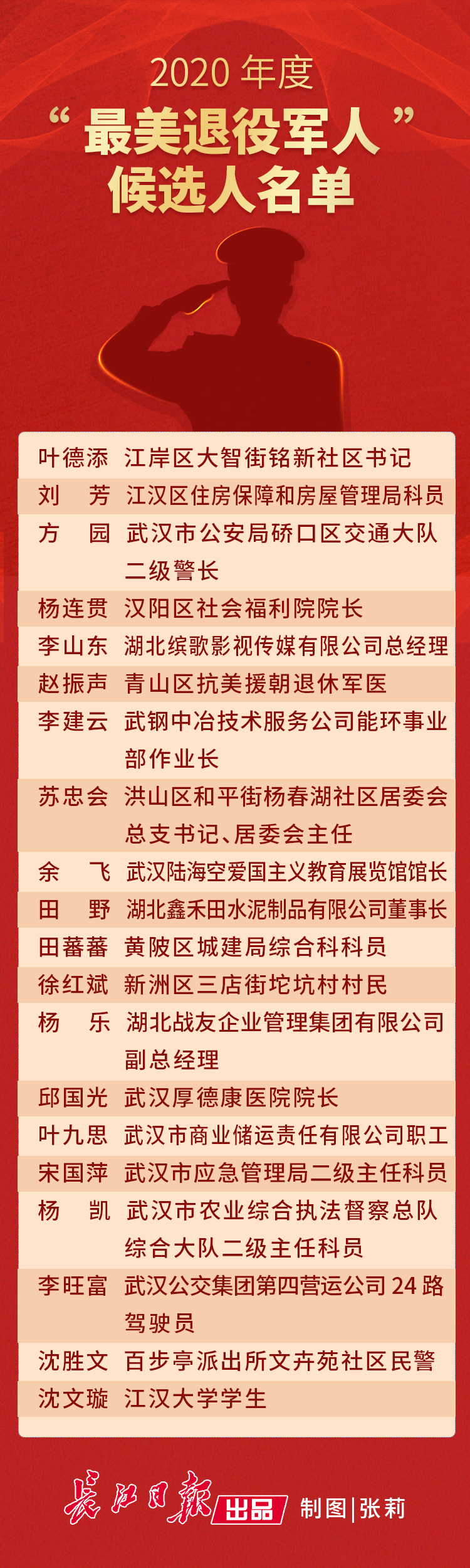 据悉,经广泛发动、层层推荐、严格评审,共推选出20名2020年度“武汉楷模·最美退役军人”候选人。为充分发扬民主、广泛听取意见,接受社会监督,现将候选人情况予以公示。